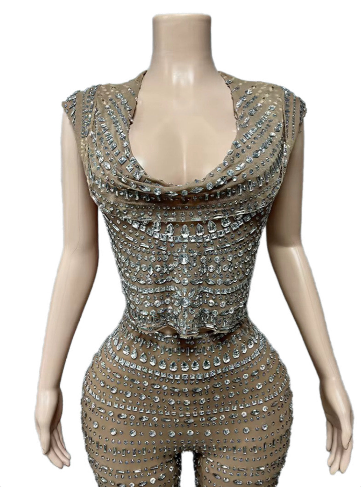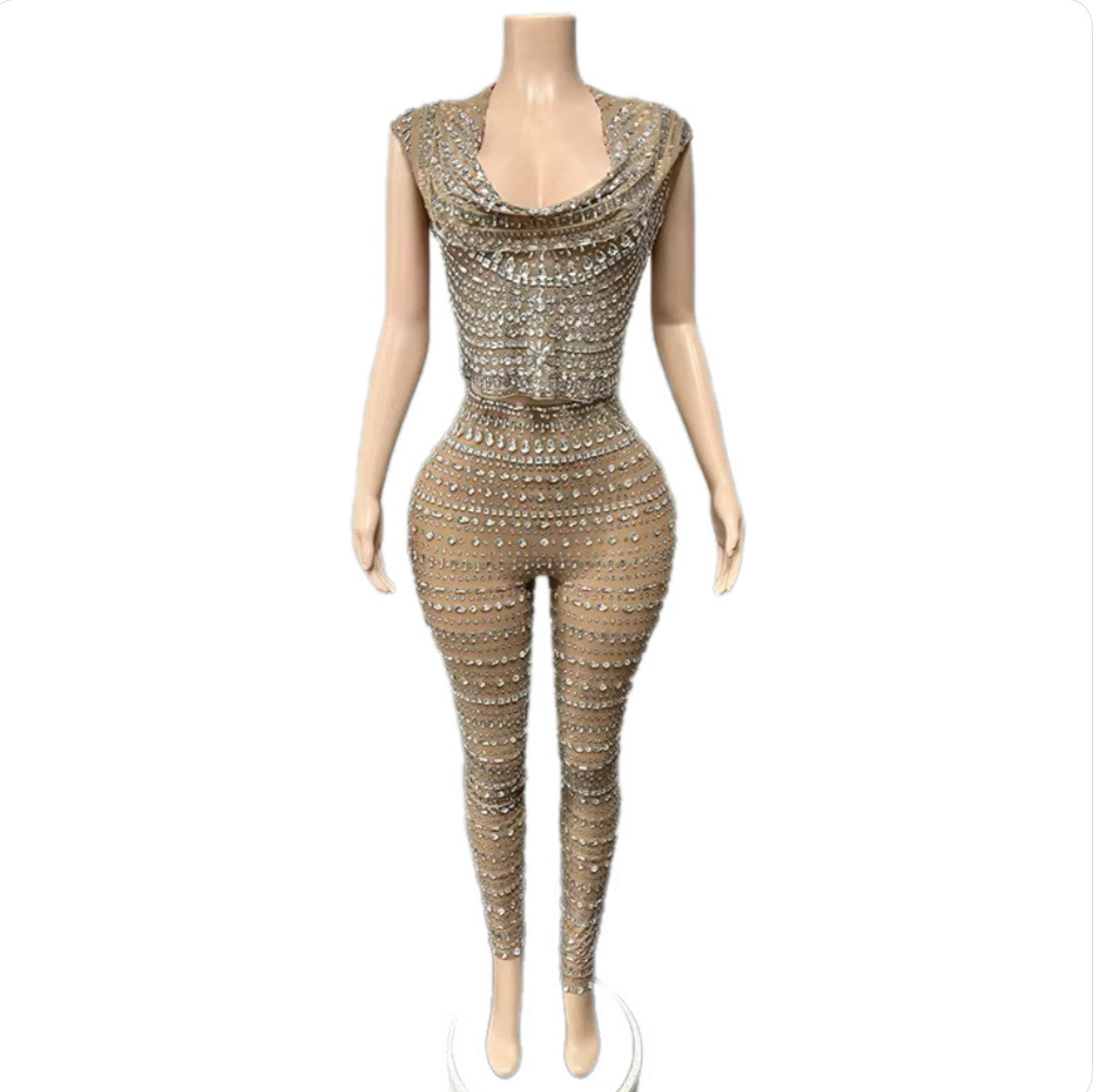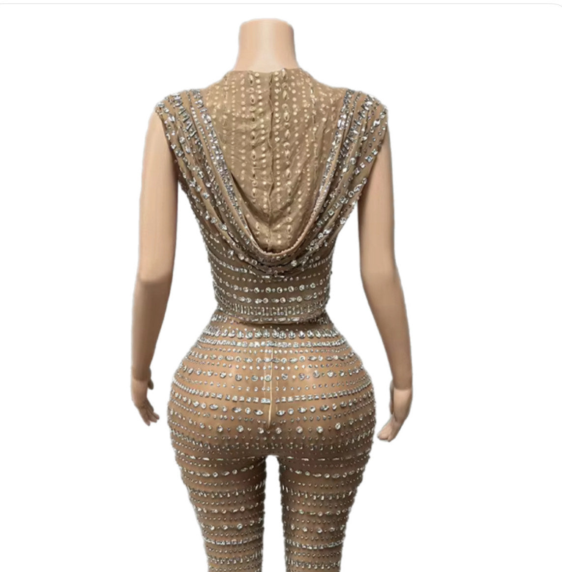 Elegant, hooded two-piece pants set dancewear with rhinestones.