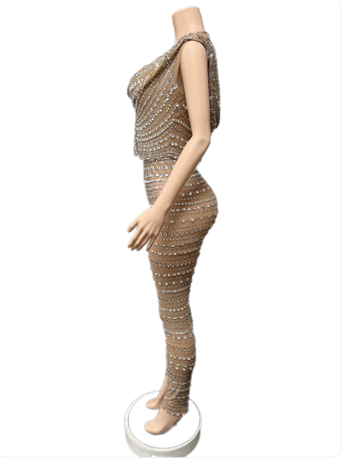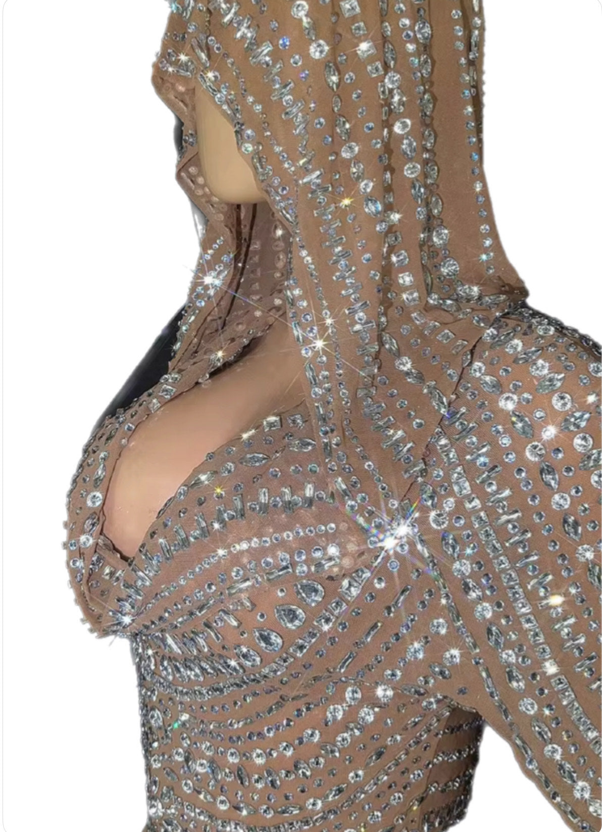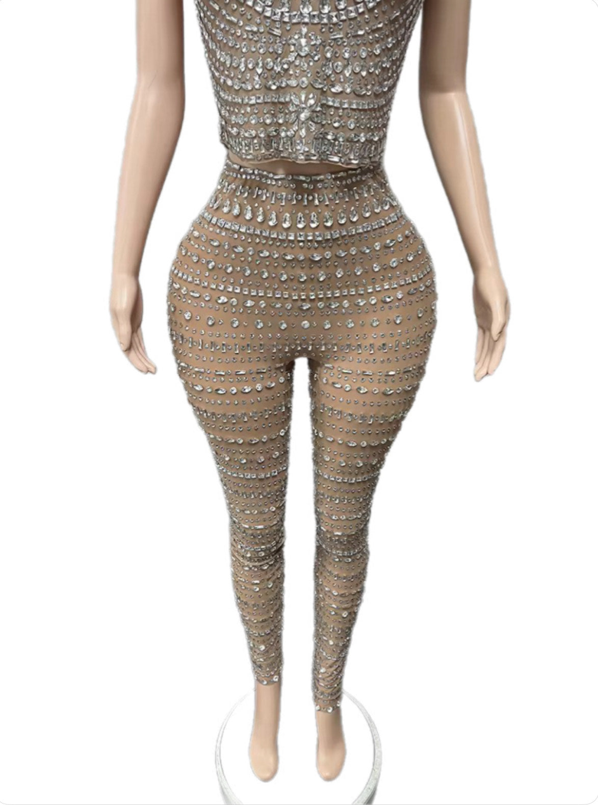 Elegant, hooded two-piece pants set dancewear with rhinestones.